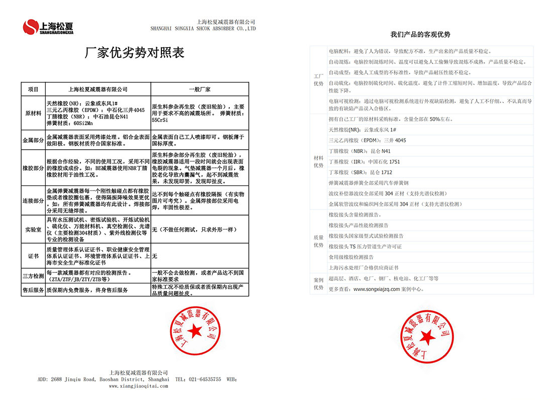 上海松夏減震器有限公司是一家研發(fā)、銷售、服務為一體的綜合性企業(yè),2009年注冊成立,注冊資金2000萬,稅號91310114687364918A,公司位于上海市寶山城市工業(yè)園區(qū),由于2017年上海環(huán)保大整改,目前我公司的橡膠制品生產(chǎn)已經(jīng)全部搬至外省江蘇新工廠和浙江新工廠生產(chǎn)。金屬制品仍在上海工廠。我公司產(chǎn)品廣泛用于化工、建筑、給水、排水、石油、輕重工業(yè)、冷凍、衛(wèi)生、水暖、消防、電力等基礎工程。